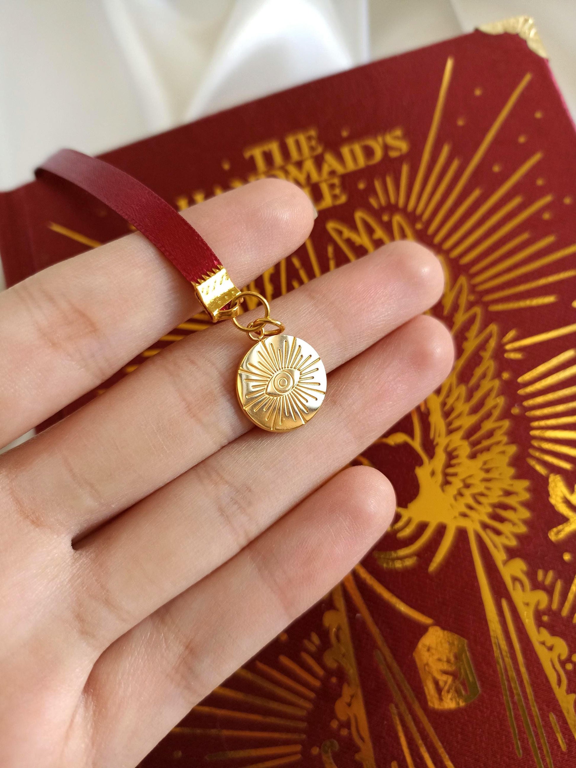 Handcrafted rebound edition of The Handmaid's Tale, made with luxurious wine red fabric with a stunning golden vinyl design. The cover showcases a unique tattoo inspired style, making it a one of akind collectible.